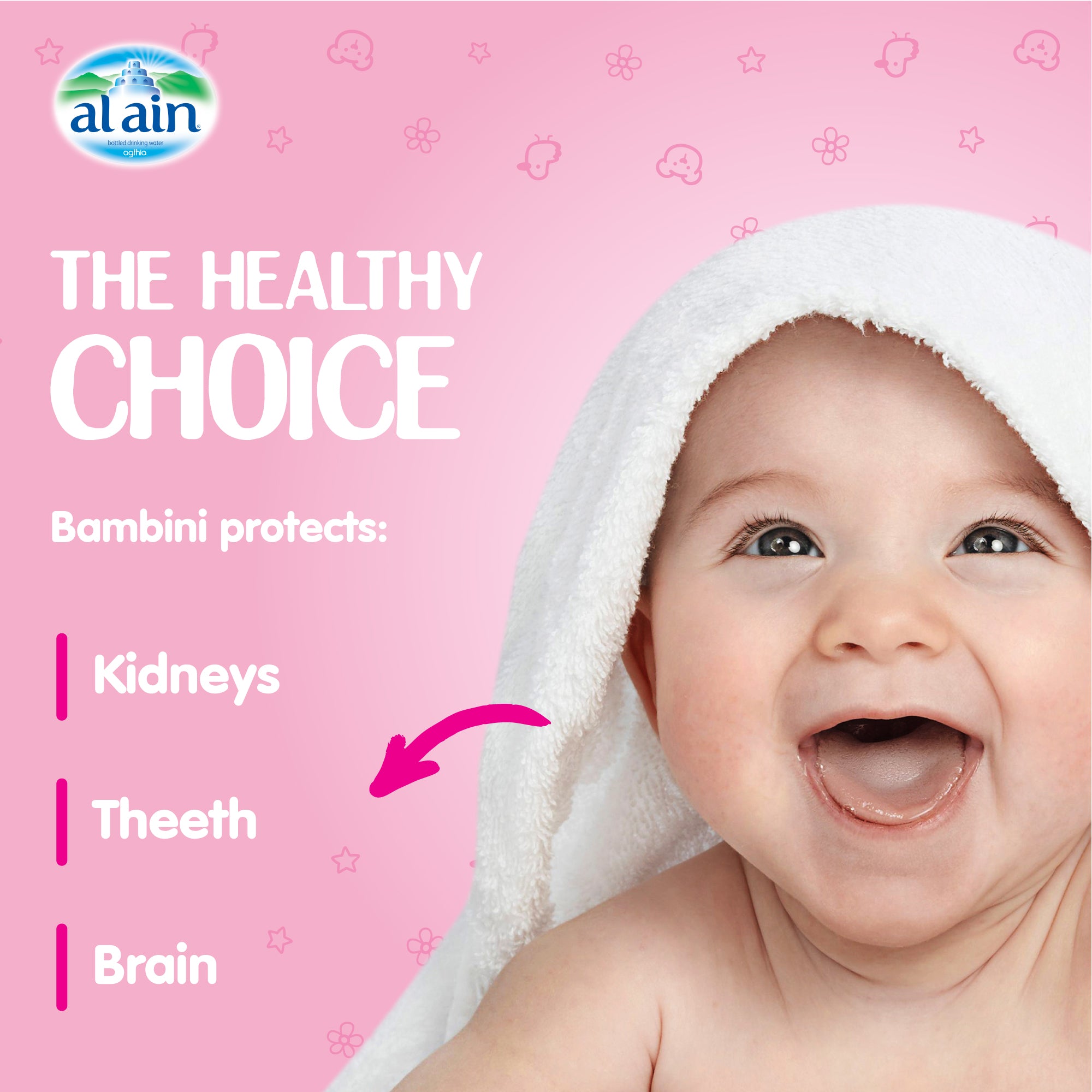 BABIES DESERVE THE BEST: Al Ain Bambini Water contributes to your baby's overall well-being. Babies deserve the best, so by ditching sugary drinks and opting for Al Ain Water, it will help their digestion and growth and enhance their mental clarity.