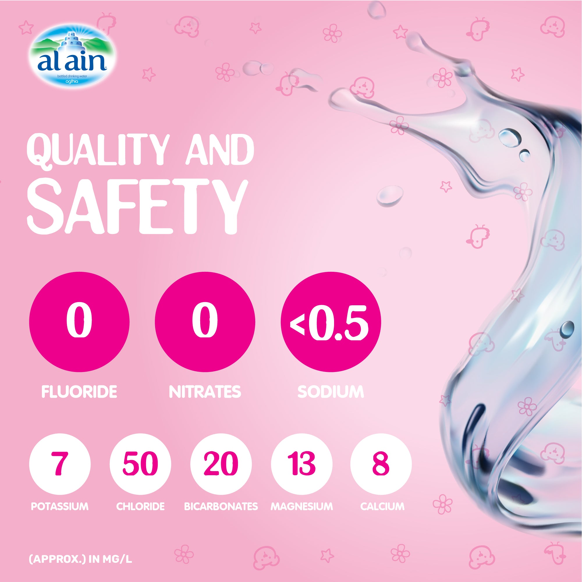 THE PUREST FORM OF WATER: Free from sodium, bromate, fluoride, and nitrates, Al Ain Bambini protects your baby’s kidneys, teeth, and brain, delivering the purest and safest water for your little one’s health and development.