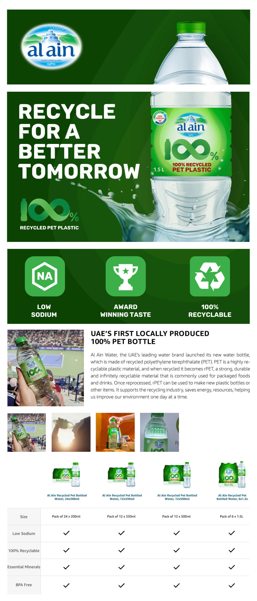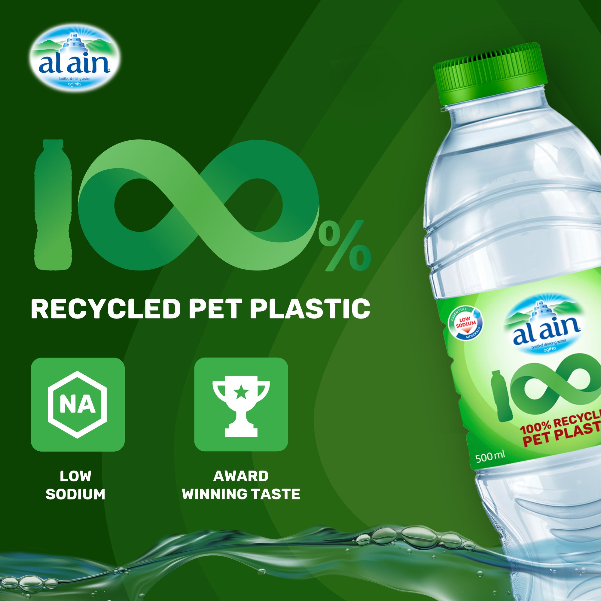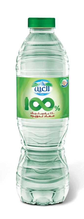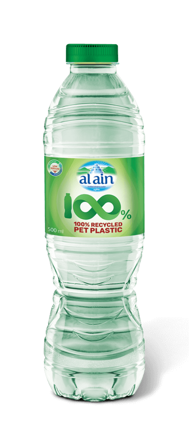 AL AIN WATER 100% rPET BOTTLE: Made from post-consumer recycled plastic, this bottle is infinitely recyclable and produces 75% less CO2 emissions, using less energy than virgin materials. It offers a better ecological balance.