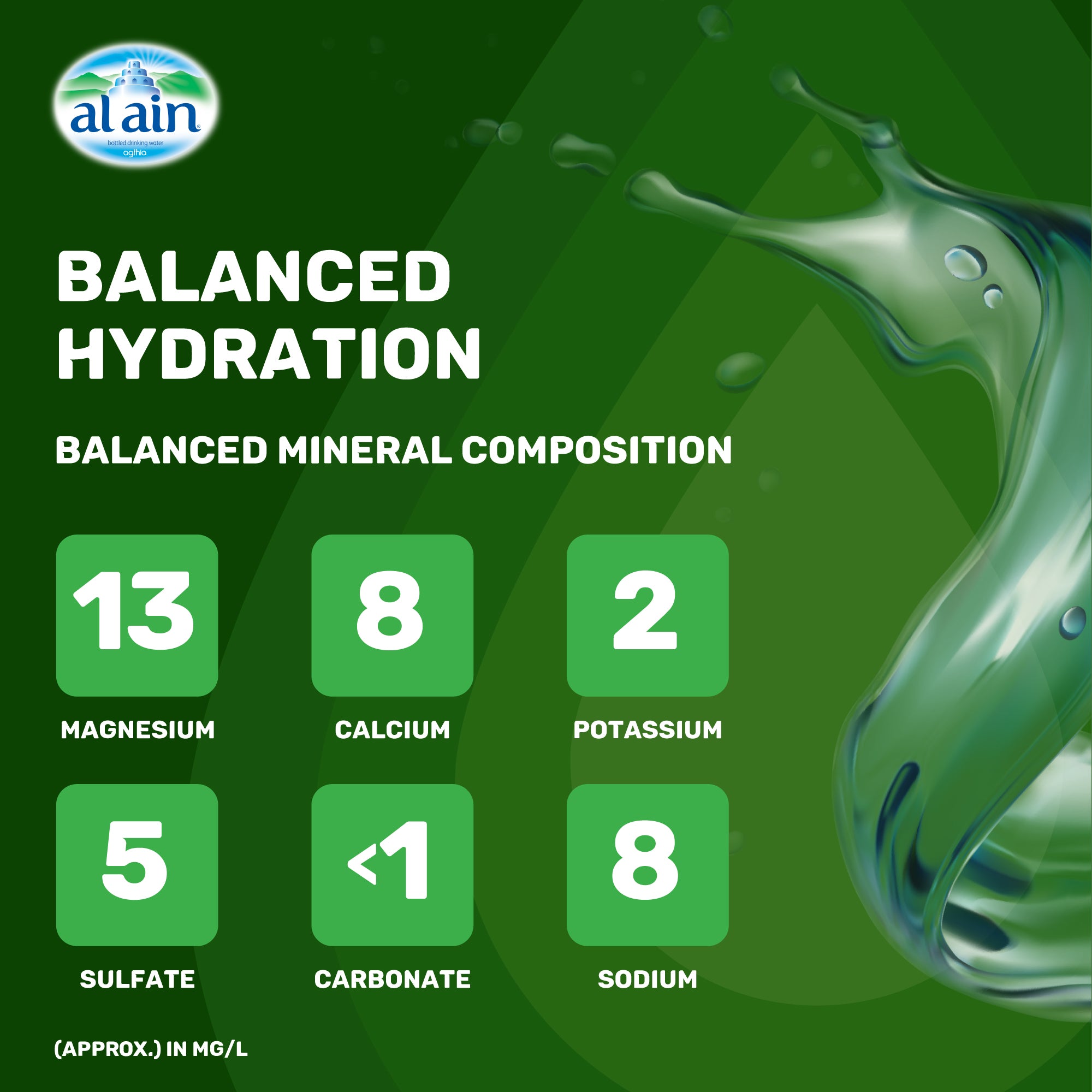 AL AIN WATER: With the right mineral balance, Al Ain bottled water is your ideal choice of hydration, offering reliable refreshment, revitalization, and nourishment for your body.